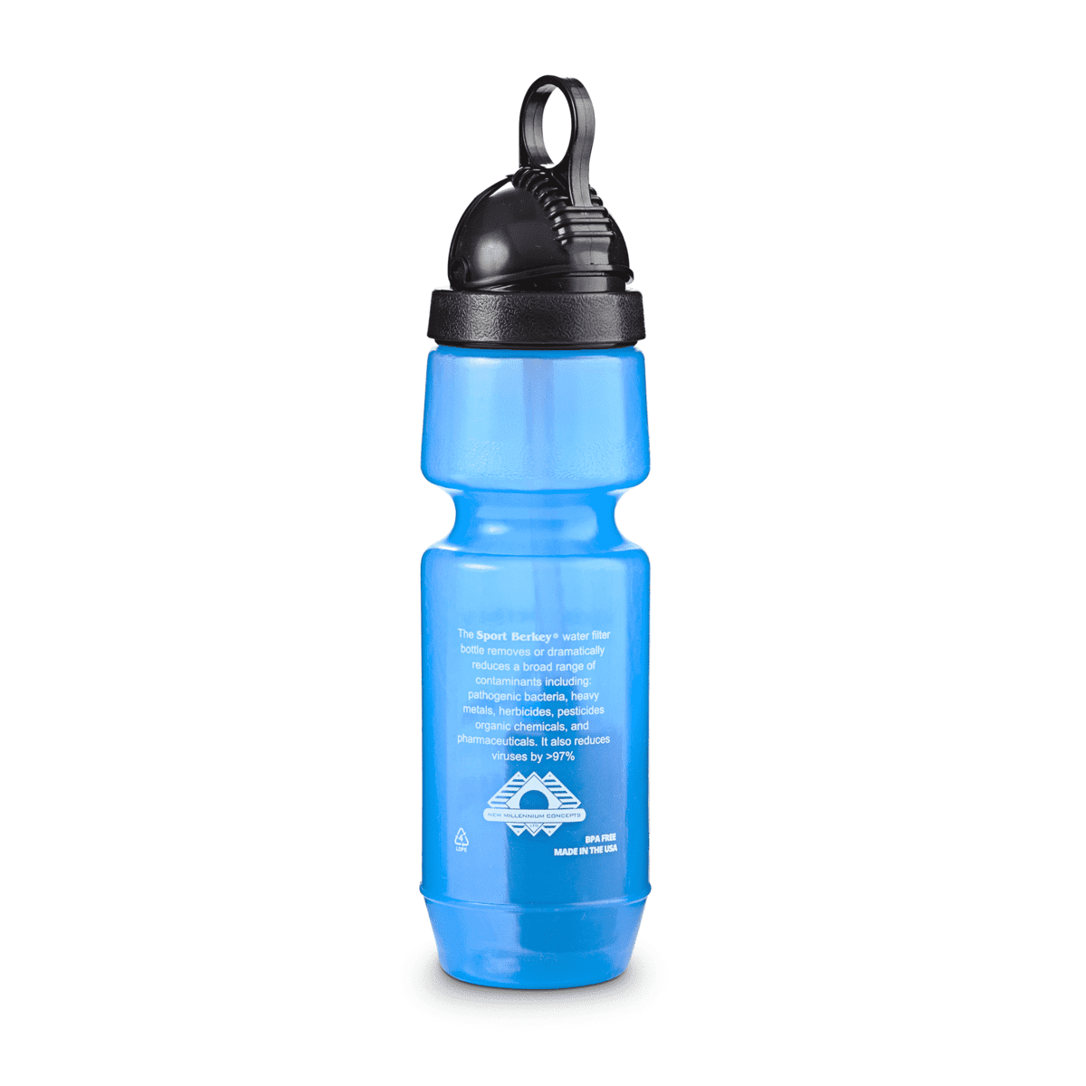 The Sport Berkey Portable Water Filter is the ideal personal protection traveling companion — featuring the IONIC ADSORPTION MICRO FILTRATION SYSTEM. The theory behind this innovation is simple. The bottle’s filter is designed to remove and/or dramatically reduce a vast array of health-threatening contaminants from questionable sources of water, including remote lakes and streams, stagnant ponds and water supplies in foreign countries where regulations may be sub-standard at best.