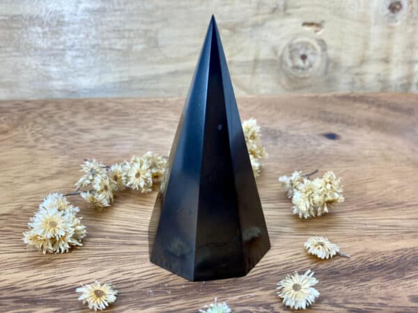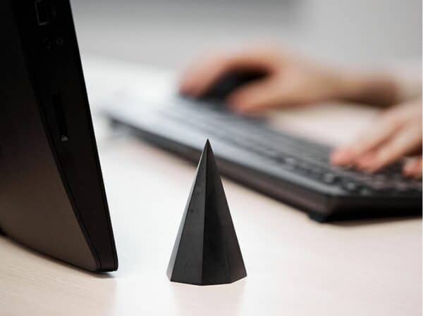 Regular use of a Shungite pyramid is said to balance and regulate your energy field, completely neutralizing it to correct any imbalances while also strengthening and reenergizing it. It is a tool of electromagnetic protection and a contributor to the process of healing electro-sensitivity. It acts as a protector and a transformer of any negative, harmful or electromagnetic energy. Shungite also does not take a charge when exposed to EMFs.